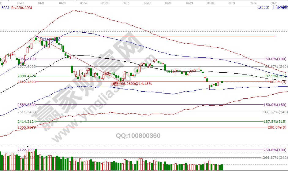 6號開盤前贏家江恩系統VIP學員區發周期共振圖,指數觸及極反通道藍色下軌線2744點后激進者開倉,并于當天收盤分析中給出反抽目標位是波段百分比延伸線180度2834附近,今日指數高開上攻正好到13號分析的反壓位2829點回落,學員區繼12號提示分批第一次減倉獲利后,今日早盤觸及15分鐘藍色上軌線再度做圖分析達到獲利了結條件。隨著時間窗口、目標價臨近,代表價格將再會進入一次較大波動期,另外早盤談到科技股短期高點形成,激進者剩余最后一批倉可以以百分比延伸線120度2791為參考線。8月15號盤中壓力是225度2815點、270度2829點,盤中支撐是135度2786點、90度2772點,本周五日線時間窗口。操作策略,指數生命線下弱勢區運行,激進者3成倉交易,穩健者空倉休息。