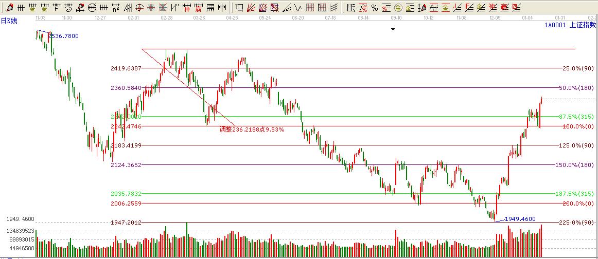 ★依據贏家波段百分比伸線提示:大盤依然在315度2270上方運行,下一位置就是其180度位置壓力2360附近了。315度位置不破看多。