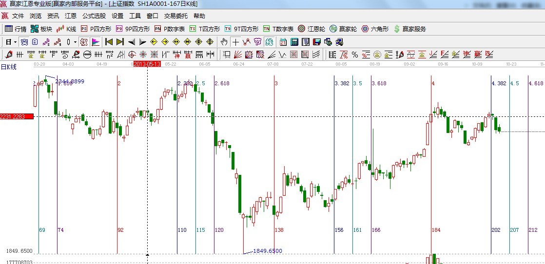 ☆依據(jù)贏家江恩系統(tǒng)波段百分比延伸提示:零度位置2160是下方百分比線;