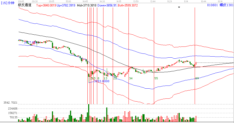 螺紋跌至新低,極反通道弱勢紅色外軌,然后震蕩周強,在15分周期的55根k線回踩極反通道生命線,按照極反通道買賣法則,突破極反通道生命線然后回踩生命線的位置為最佳買點,第一目標極反通道上軌今日開盤最高點位跟5分鐘的極反通道上軌位置共振賣點,然后回落,跌至15分極反通道生命線的位置【這個位置是前期高點的位置,形成一個強有力的支持買點,遇到時間89時間周期最后尾盤30分鐘強勢拉起的原因。
