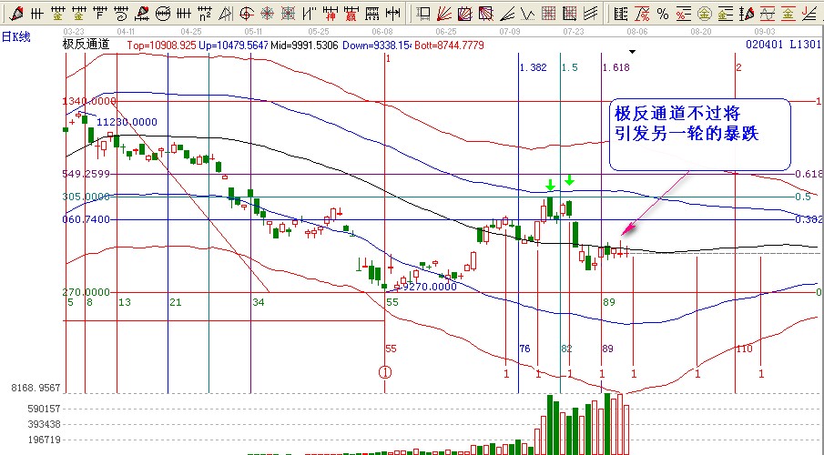 時間我們根據贏家的k線時間四方形點擊2012.6月8日的地點,設置步長為7對其展開的時間分割,可以看出在7.6日的一個短期下跌在7.13日的一個開始上攻,在7.20日的一個快速下跌,最近的7.27日大陽后的盤整,都起到了一個重要的作用,明日8.3日也是這個時間窗口,如果不能突破極反通道生命線的位置【9740】點有可能結束盤整引發新一輪的下跌。